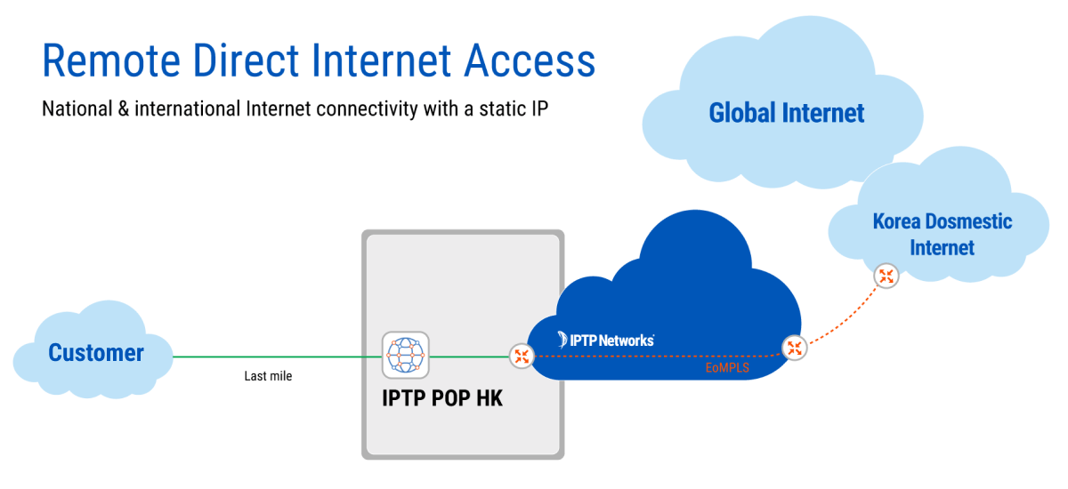 Para comenzar, nuestro cliente debe tener una conexión con nuestro Punto de Presencia (POP, por sus siglas en inglés). En este caso, primero deben conectar su última milla al POP IPTP en Hong Kong. Luego, les proporcionamos nuestro excelente servicio L2 EoMPLS desde nuestro POP en Hong Kong hasta nuestro POP en Corea. Por último, desde ese POP IPTP de Corea, suministramos nuestro servicio DIA para nuestro cliente, lo que le permite utilizar la dirección IP de Corea para acceder al Internet nacional de Corea, estando a miles de kilómetros de distancia.
