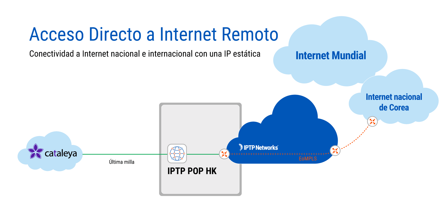 Para comenzar, nuestro cliente debe tener una conexión con nuestro Punto de Presencia (POP, por sus siglas en inglés). En este caso, primero deben conectar su última milla al POP IPTP en Hong Kong. Luego, les proporcionamos nuestro excelente servicio L2 EoMPLS desde nuestro POP en Hong Kong hasta nuestro POP en Corea. Por último, desde ese POP IPTP de Corea, suministramos nuestro servicio DIA para nuestro cliente, lo que le permite utilizar la dirección IP de Corea para acceder al Internet nacional de Corea, estando a miles de kilómetros de distancia.