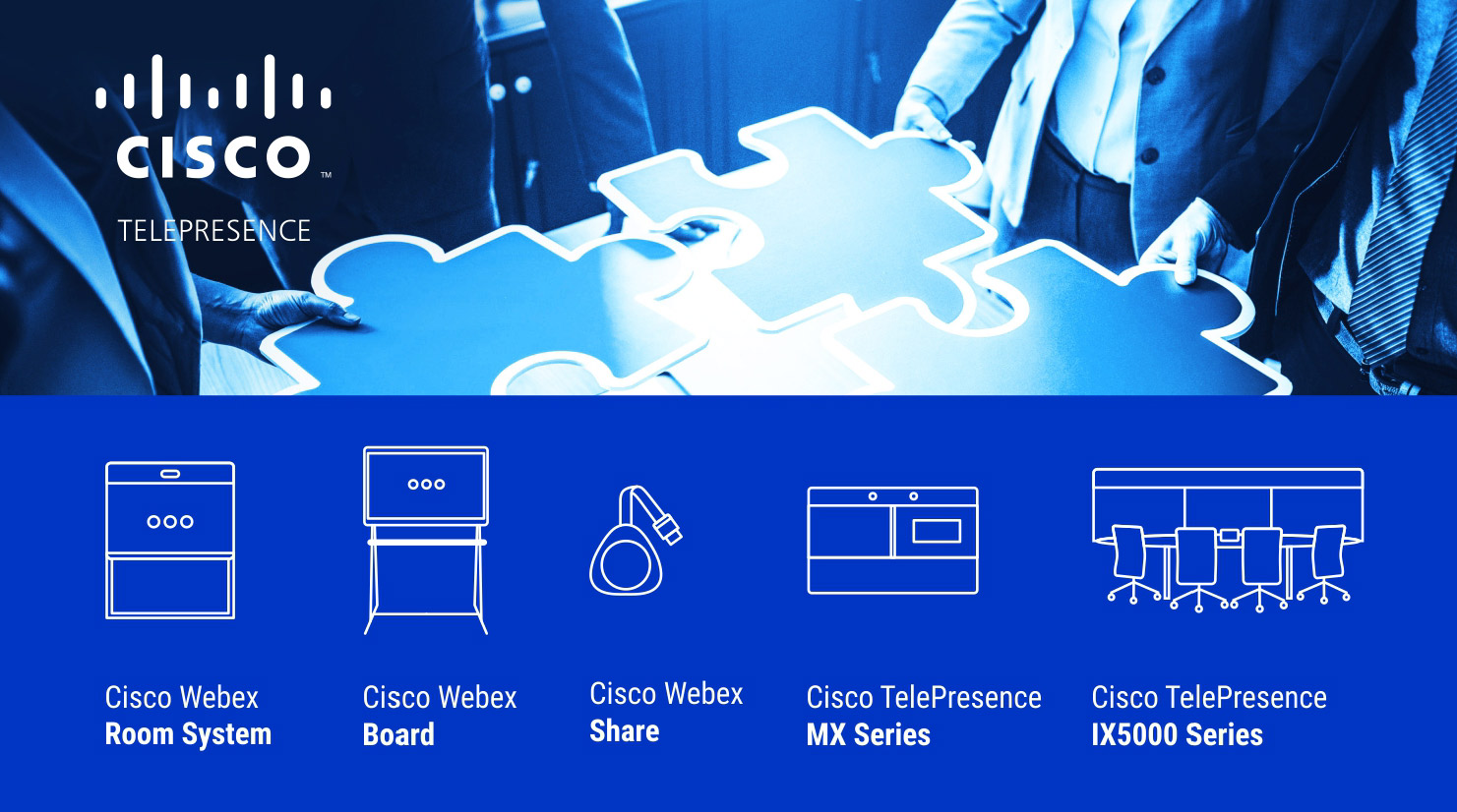 Series CISCO Webex Room là giải pháp họp video trực tuyến thông minh. Series CISCO Webex Room khá đa dạng về kích thước: nhỏ, vừa, lớn hoặc tùy chỉnh kích cỡ với Cisco Webex Room 55, Room 55 Dual, Room 70 G2 và Room Kits. Room 55, Room 55 Dual và Room 70 G2 cung cấp đầy đủ các màn hình tích hợp. Room Kit, Room Kit Mini, Room Kit Plus và Room Kit Pro biến màn hình 4K của bạn thành hệ thống hội nghị online cho phòng họp ở mọi quy mô. Dịch vụ có thể được triển khai tại cơ sở vật lý hoặc trên cloud.
