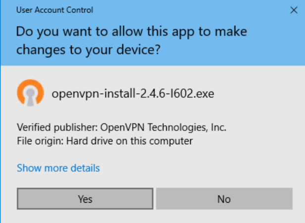 4.b. 当出现提示视窗时,单击 “是(Yes)“ 以允许 OpenVPN GUI 用户界面 对您的设备进行更改。
