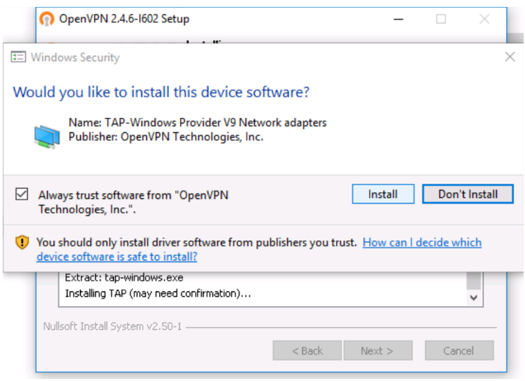 2.g. 当出现提示视窗时, 单击“安装(Install)“,以安装 OpenVPN 附带的其他软件。
