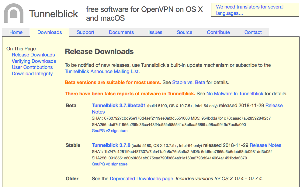 https://tunnelblick.net/downloads.html 我们建议下载最新版本的软件。 如果您的 MacOS 系统低于 10.7.5,请在以下下载页面选择合适的版本:https://tunnelblick.net/downloadsDeprecated.html