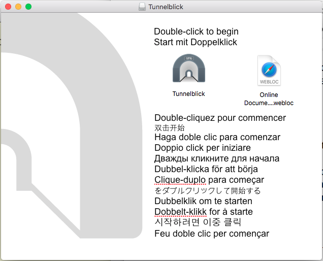 2.a. 下载 .dmg 文件档案。随后会出现新的模式窗口,其中包含 Tunnelblick 图标。 请双击应用程序图标。