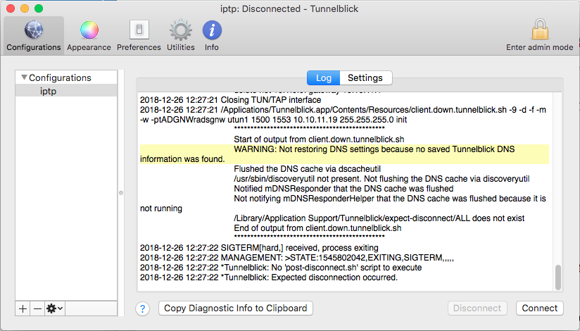 如果 VPN 连接遇到任何问题, 请单击单栏中显示的图标并选择VPN 详细信息(VPN Details),然后单击将诊断信息复制到剪贴板(Copy Diagnostic Info to Clipboard)。然后 请与 IPTP Networks 技术团队分享复制的信息。